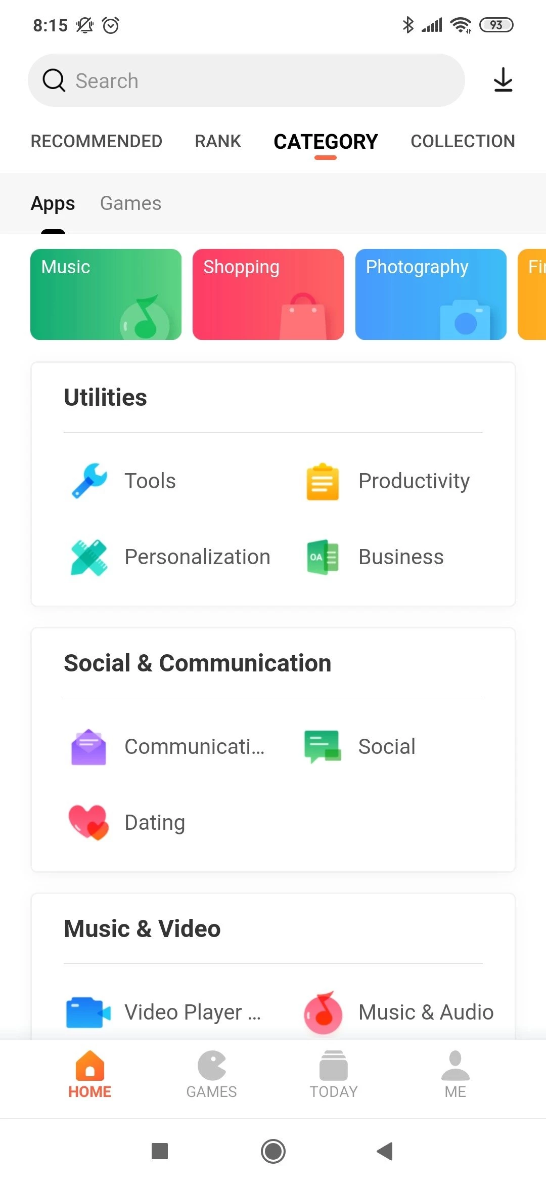 Após concluir o processo de instalação, inicie o aplicativo e faça login na sua conta. A página principal, com uma interface de usuário elegante, chama a atenção e é categorizada como comunicação, fotografia, videogames e assim por diante. Cada categoria inclui uma infinidade de aplicativos organizados de acordo com sua popularidade.